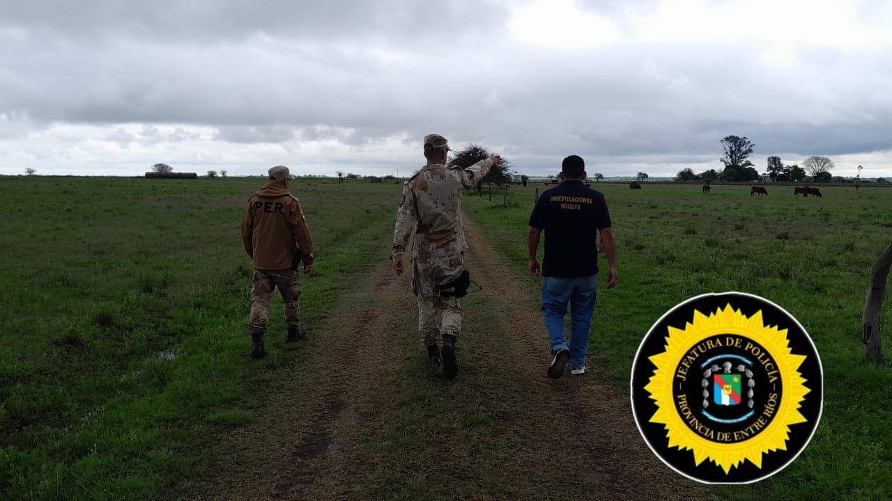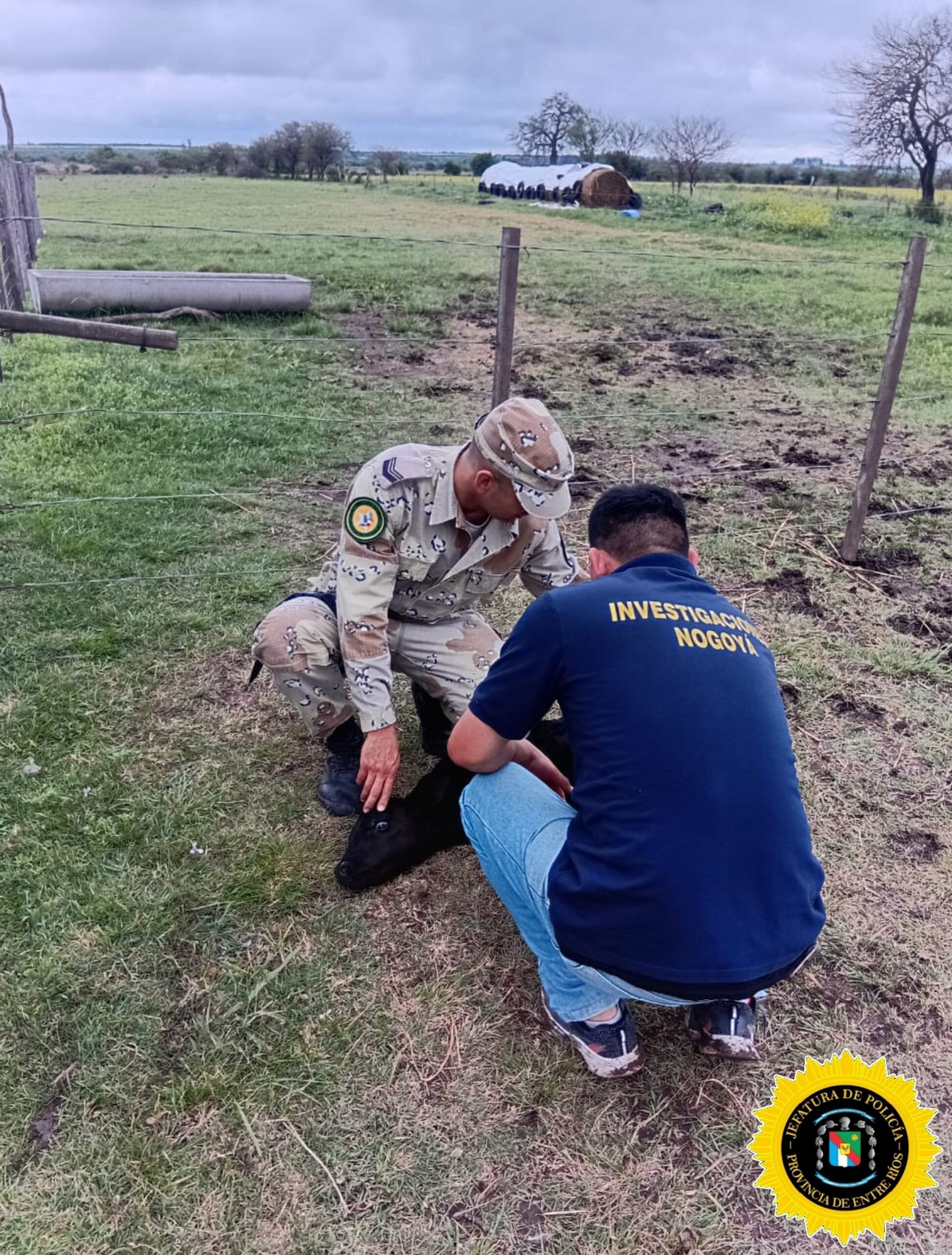En el marco de actuaciones penales por el delito de “abigeato” denunciado a primeras horas del sabado 4 del corriente por un productor rural del ejido de Nogoya, quien daba cuenta que a primeras horas de esa mañana le habían sustraido un ternero recién nacido, personal de la Brigada dependiente de la Dirección General de Prevención de Delitos Rurales en forma conjunta con personal de la División Investigaciones e Inteligencia Criminal de la Jefatura Departamental Nogoya, luego de diversas tareas investigativas que incluyeron el análisis de material fílmico entre otras, lograron determinar la identidad de los supuestos autores del ilícito, tratándose de dos masculinos, uno mayor y otro menor de edad (padre e hijo), como así también el medio de acarreo que utilizaron, todo lo cual dio motivo a un Allanamiento y requisa domiciliaria a los responsables, medida que fue tramitada por ante la Fiscalía en turno a cargo del Dr. Fernando Martinez y dispuesta por el Juzgado de Garantías en turno a cargo del Dr. Oscar Rossi.