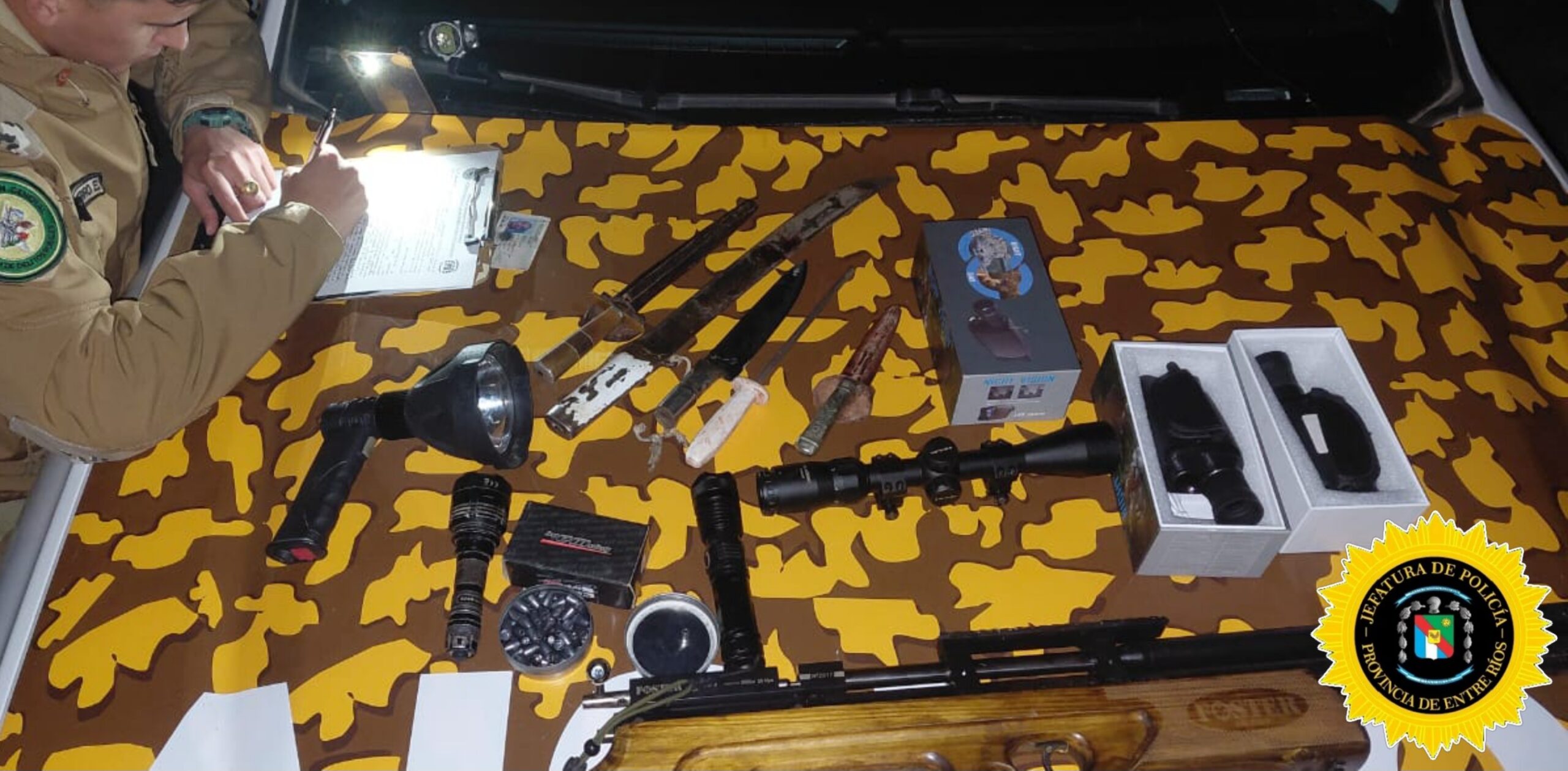 Inmediatamente, el personal interceptó a tres individuos mayores de edad, domiciliados en la ciudad de Concordia, quienes salían del interior del campo y que evidentemente eran los responsables de la cacería, por cuanto se procedió al secuestro de los elementos utilizados para la actividad cinegética, entre ellos un arma no permitida para la caza menor (PCP), visores nocturnos, cuchillos, machete, linternas y un reflector de mano. La caza se realizaba en horario nocturno y sin las licencias de autorización correspondientes, agravando la infracción.