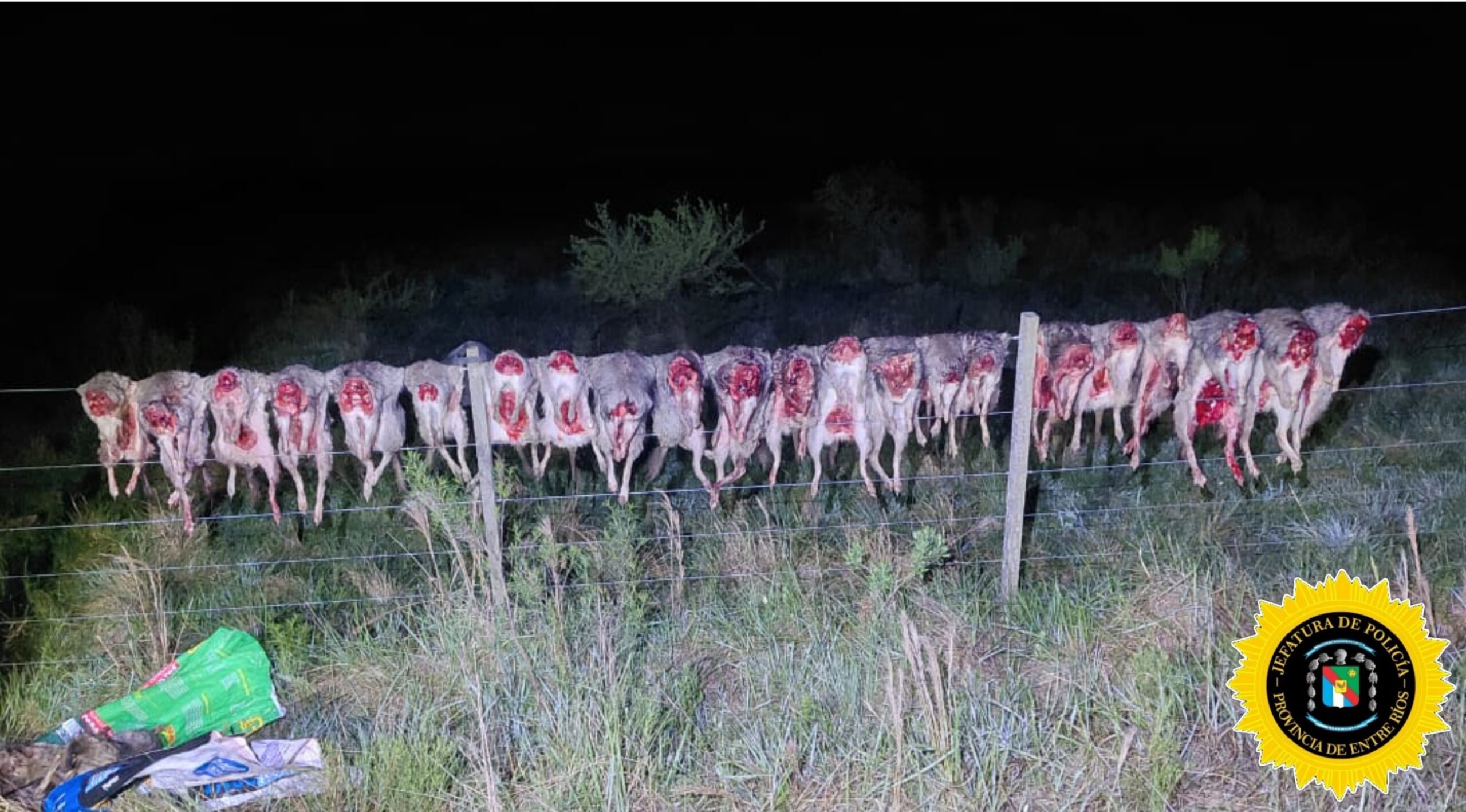 Durante la recorrida preventiva, los uniformados detectaron un vehículo estacionado a un costado del camino y en las inmediaciones hallaron 35 viscachas (_Lagostomus maximus_) recientemente muertas y evisceradas que estaban colgadas en el alambrado, evidenciando una caza masiva y depredadora de la especie, cuya practica se encuentra prohibida por la normativa provincial.