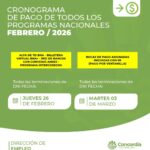 La Dirección de Empleo de la Municipalidad de Concordia informa a los beneficiarios el cronograma de pago de todos los Programas Nacionales, correspondiente al mes de febrero de 2026.