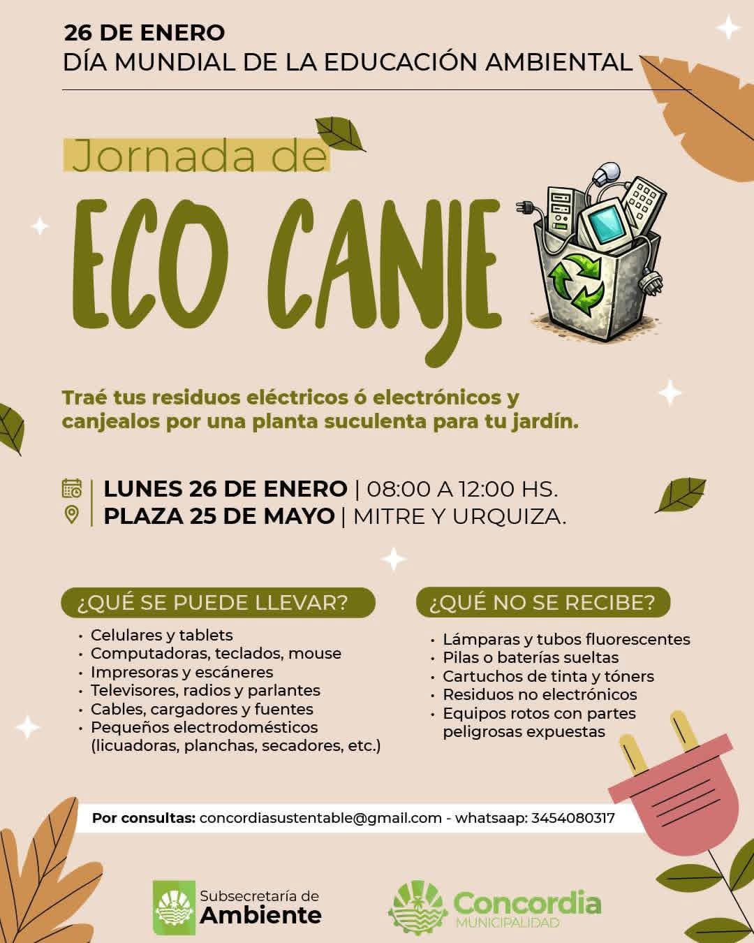 En el marco del Día Mundial de la Educación Ambiental, que se celebra el 26 de enero, la Subsecretaría de Ambiente de la Municipalidad de Concordia llevará a cabo una jornada de Ecocanje.