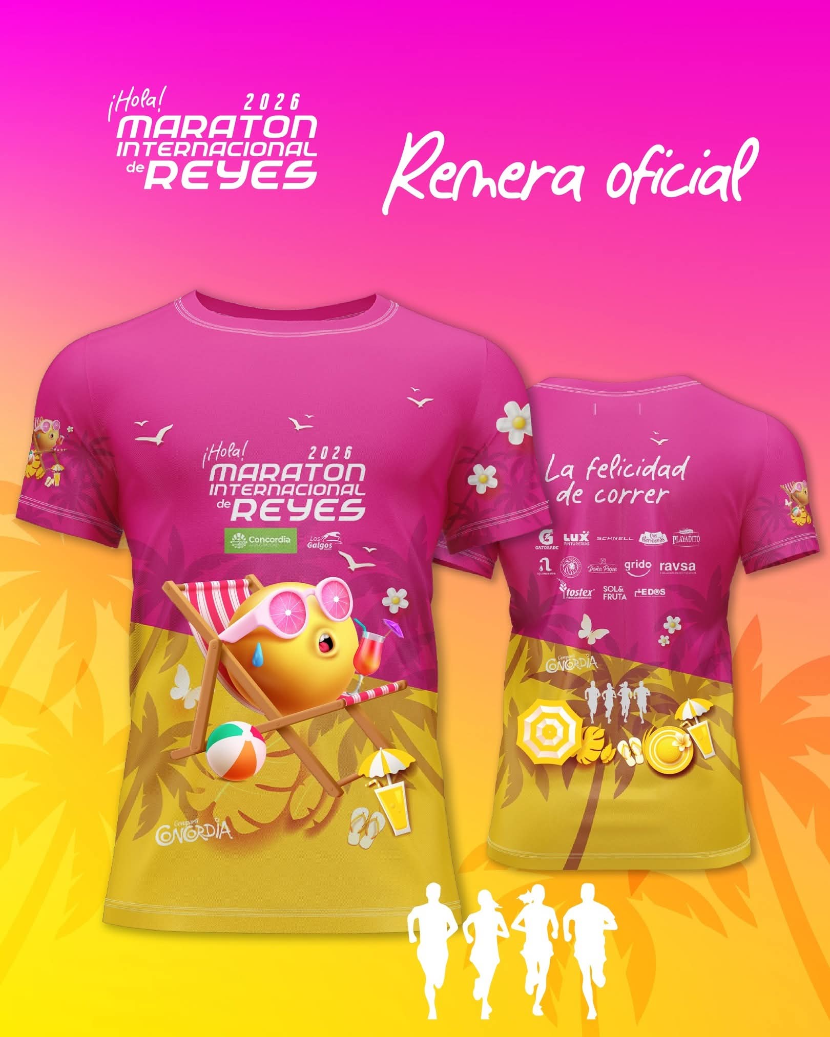 “Con los colores del verano que además transmiten la calidez, la empatía y la pasión con la que vivimos esta estación del año en Concordia. A la vez, una naranja como símbolo de nuestra ciudad, la Capital Nacional del Citrus, en una reposera, disfrutando del verano, a la vera del río Uruguay” explicaron sobre el diseño que vestirá el recorrido de la carrera.