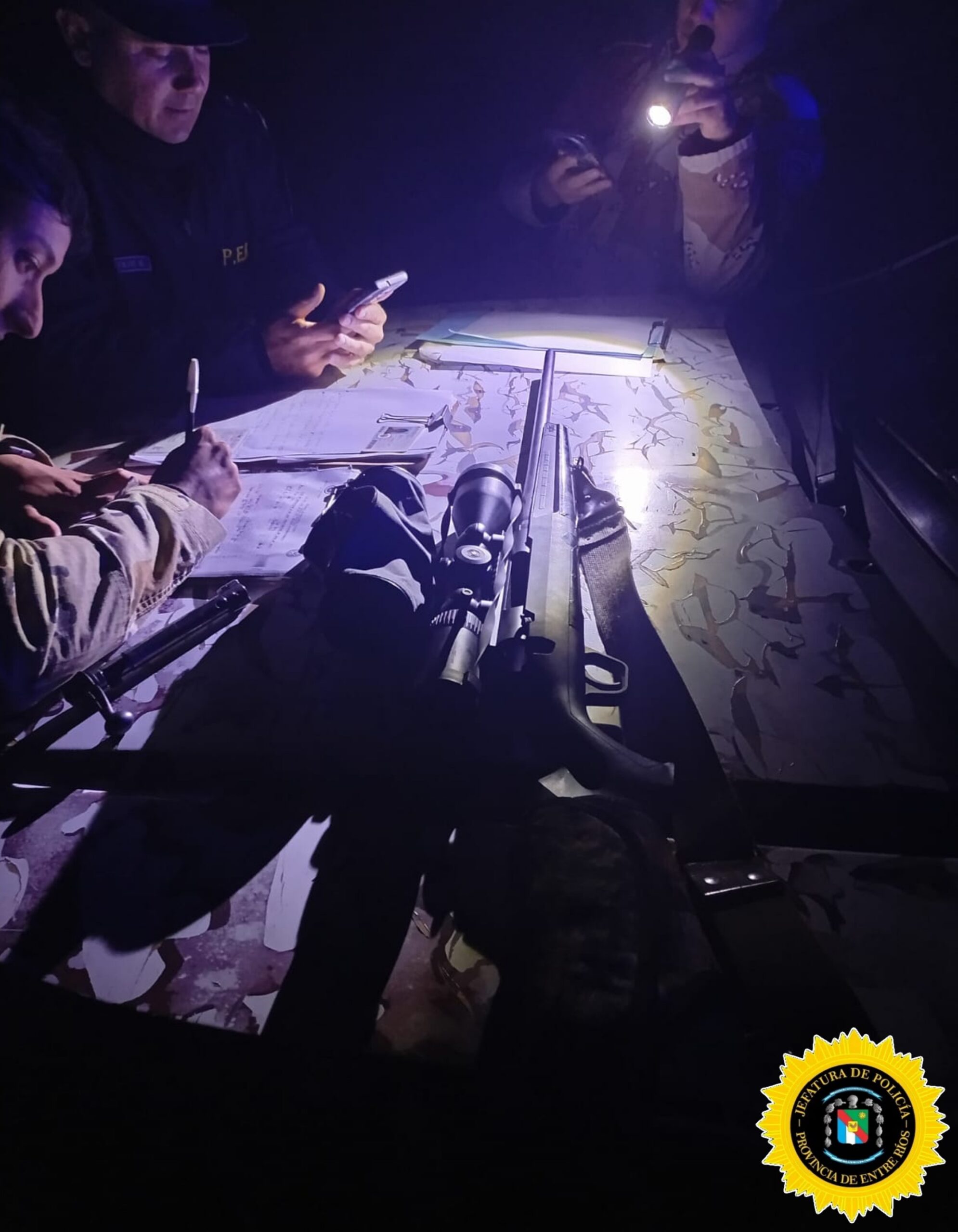 Por su parte la Brigada Interdepartamental con asiento en Bovril, sobre la medianoche de este jueves en colaboración a Comisaría Mojones Norte en el Departamento Villaguay, llevo a cabo otro procedimiento por aplicación a la misma ley en circunstancias que los policias interceptaran un automóvil Citroën C3 color azul, reflectoreando por los caminos hacia el interior de un campo, en el que se conducian dos ciudadanos de la localidad de Bovril, a quienes les incautaron un arma larga de fuego, Carabina a repetición calibre .308 PLG Winchester, marca Savage, con mira telescópica.